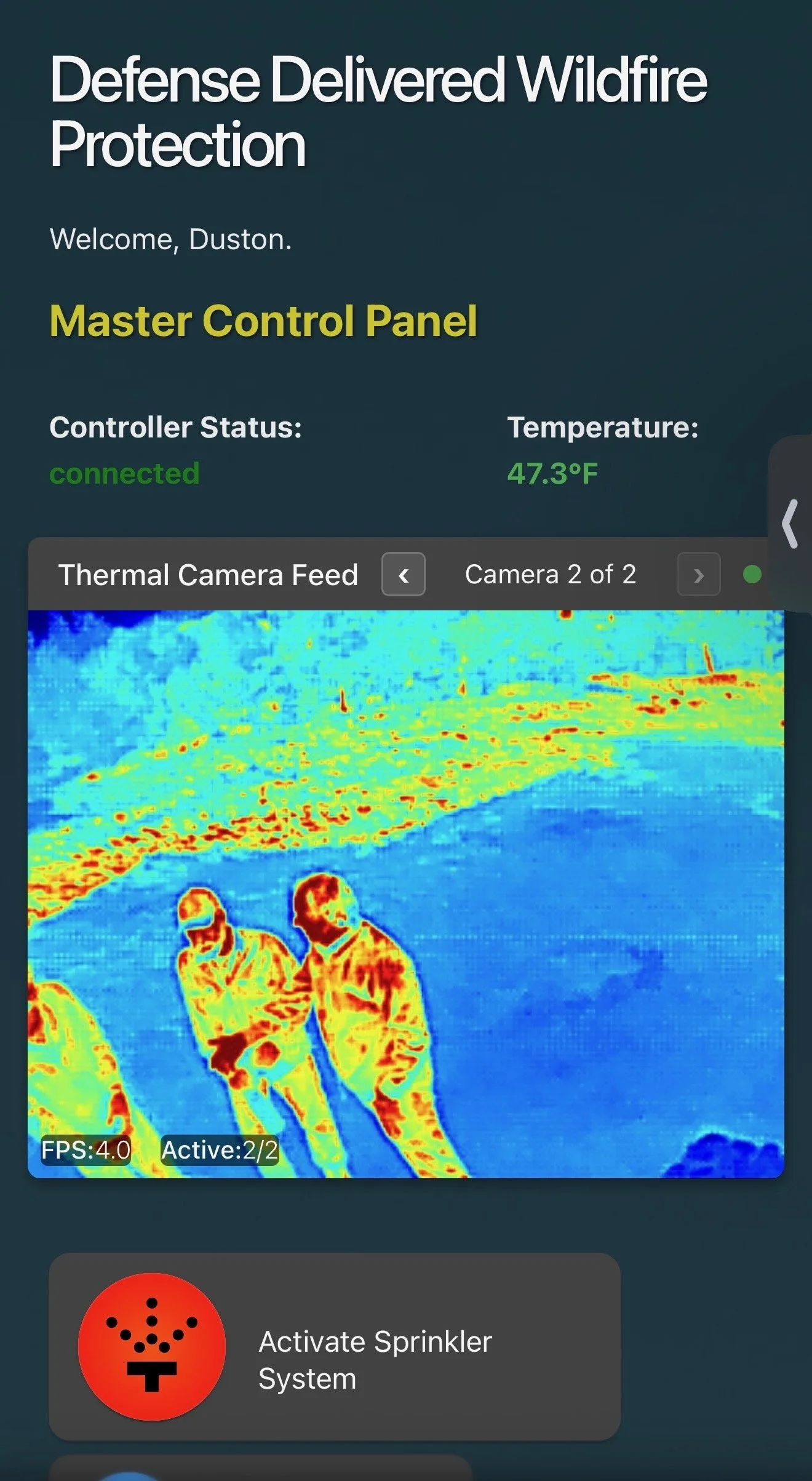 After home hardening, our Real Intelligence-powered Automated Exterior Sprinkler system is your last line of defense. With data fusion from thermal cameras, satellite wildfire alerts, and temperature sensors, our system automatically activates as fire danger approaches your property using a graduated response to initially pre-wet exterior surfaces, then soak exterior surfaces, and finally deploy US Forest Service-approved Class A foam, if needed.